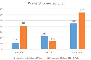 Betzl von Solarwatt wies darauf hin, dass sich an der Vertikalfassade den Winter über mehr Strom erzeugen lässt als auf dem Dach. Dies hätten Studien belegt, Zahlen weist die Abbildung von Solarwatt aus. Die Firma mit Hauptsitz in Dresden bietet PV-Module mit abZ für Anwendungen in Fassaden an. Die Lastfreigaben entsprechend der DIN 18008, die Brandsicherheit B-s1, dO gemäß EN 13501-1 und Broof(ft) gemäß EN 13501-5. Für Produkt und Leistung wird eine Garantie von 30 Jahren gegeben. Für das zweite Halbjahr 2025 kündigte Betzl neue Module an, die für deutlich höhere Windlasten ertüchtigt wurden und statt einer Leistungsdichte von 200 Wp/m² durch TopConTechnologie 230 Wp/m² ermöglichen.