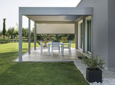Für das kubische Lamellendach Artares bietet Weinor Ganzglas-Schiebewände für ein wettergeschütztes Outdoor-Living. Mit Somfy-Technik ist das Terrassendach automatisiert steuerbar: der Lamellenmotor, die Farb-LED-Bänder und die LED-Bänder mit warmweißem Licht sowie die Vertikalbeschattungen und das Heizsystem Tempura. Um die Terrasse zuverlässig gegen Regen abzuschirmen, lassen sich neben den Lamellen die seitlichen Glasschiebewände schließen. Scheint die Sonne und mehr Ventilation ist unter dem Wetterschutz gefragt, werden die Lamellen und Unterbauelemente geöffnet – schon kann die Luft zirkulieren. An kälteren, sonnigen Tagen erwärmt sich bei geschlossener Anlage die Luft unter dem Dach. Das stellt bei Lamellendächern mit Hausanschluss durch den Dämmeffekt einen nicht zu unterschätzenden Energiesparfaktor dar, wie Weinor betont. Die Unterbauelemente lassen sich zusätzlich mit der in das Lamellendach integrierten Vertikalbeschattung kombinieren. Artares kann sowohl im Paket mit den Glasschiebewänden als auch mit der gewünschten Steuerungsoption im Weinor-E-Shop konfiguriert und auf einem Transportgestell direkt an den Montageort bestellt werden.