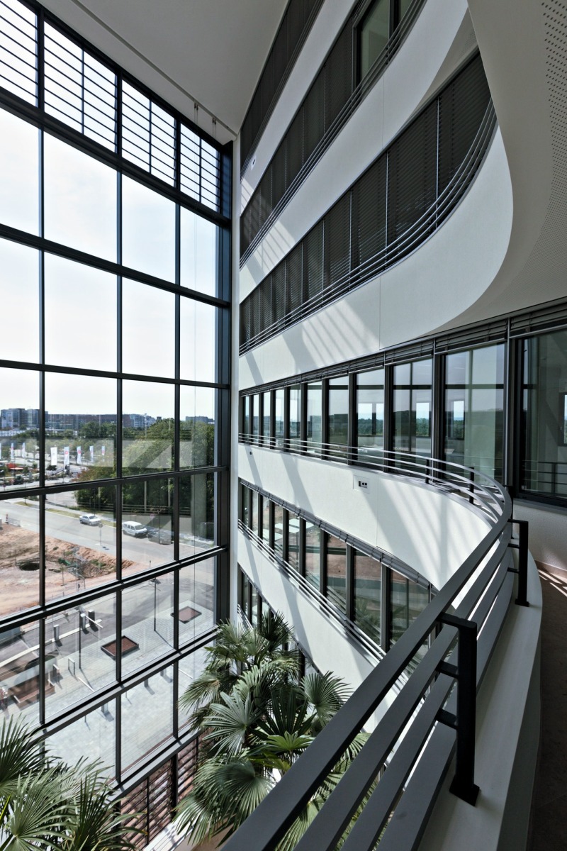 Der harmonische Eindruck der Außenfassade wiederholt sich konsequent in der Gestaltung der inneren Fassade. Die feine Linienführung und gezielte Farbgebung, die auf der Außenseite sichtbar wird, erfolgt im Inneren durch die silbergrauen Elemente der Laibungs- und Fensterbankprofile sowie der Profile der Umwehrungen. Auch die Sonnen- und Blendschutzlamellen korrespondieren farblich mit der Außenfassade. Sie sind silbergrau beschichtet und gegen die Retroreflexion mit einem matten Grauton auf der Rückseite ausgestattet, der für Bildschirmarbeitsplätze geeignet ist.