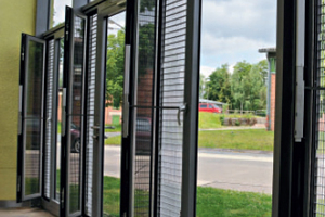 Lichtspiele in Pausenhalle. Die Halle mit dem transparenten Solardach und einer Schüco Pfosten-Riegel-Fassade aus Stahl fungiert als Wetterschutz. Ausführendes Metallbauunternehmen war Rainer Mantel, ansässig in Bad Karlshafen. Überstromöffnungen in der Halle und die Zuluft in den Klassenzimmern lassen sich über den mechatronischen Beschlag TipTronic automatisch über eingegebene Werte steuern. „Wird in der Halle oder auch in den Klassenzimmern eine höhere Temperatur als außen gemessen, dann öffnen sich die Fenster und Türen automatisch, die Luft in den Räumen kühlt ab“, erklärt Dohmann. Während des Unterrichts ist die Automatik deaktiviert.