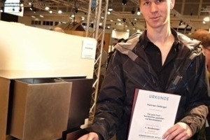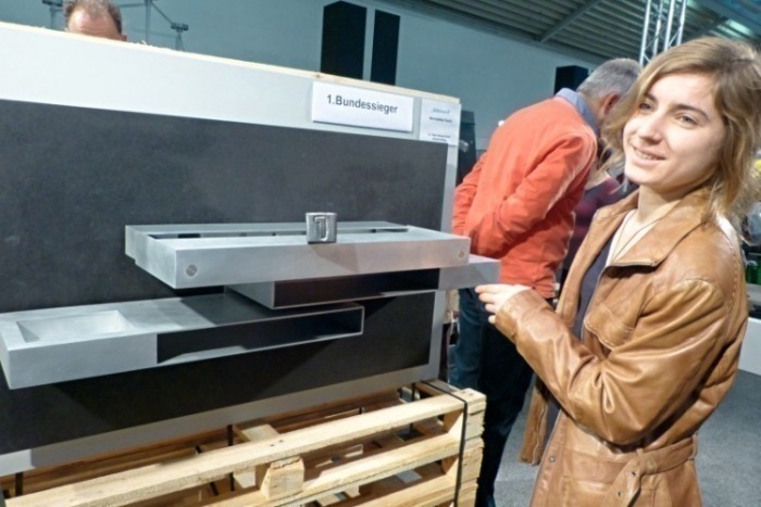 Auch Hannes Geltinger (20), der im Betrieb von Josef Scheidhammer (Bodenkirchen) gelernt hat, überzeugte die Jury mit seinem Sideboard, das in Bayern als Aufgabenstellung vorgegeben war. Er spielte mit der quadratischen Form (450 x 450 x 200 mm) aus Edelstahl und Messing. Geltinger besucht derzeit eine Berufliche Fachoberschule (BOS), um das Abitur nachzumachen.