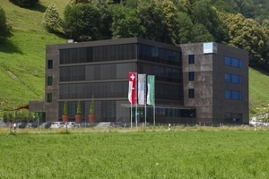 Unifarben, aber nicht eintönig. Um den Neubau ästhetisch mit der idyllischen Berglandschaft zu verbinden, kombiniert die Fassade das Flair des Standorts und die Unternehmensidentität zu einer Einheit: Die großflächige Glas-Alu-Fassade spiegelt dabei die Innovationskraft und das fortschrittliche Tätigkeitsfeld der EPC, der Sichtbeton die Bergwelt sowie die Kaverne im Inneren. Dass der Kubus dennoch wie aus einem Guss wirkt, liegt an der einheitlichen Farbgebung in dunklem Graubraun.
