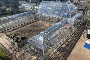 Bei dem Schaugewächshaus im Botanischen Garten Köln handelt es sich um eine dreiflügelige Stahl-Glas-Schalenkonstruktion, deren 8 und 17 Meter hohe Kuppelhallen ineinander verschränkt sind. Sie werden, sobald der Innenausbau abgeschlossen ist, sowohl Wüsten- als auch tropische Pflanzen beherbergen.