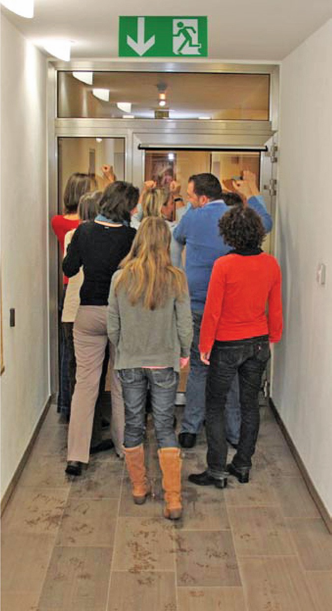 Die spezielle Fluchtfunktion einer Tür wird nur im Zusammenspiel aus Türblatt, Zarge und Beschlagteilen erreicht. Für „Fluchttüren“ wird in den Produktnormen EN 14351-1 für Fenster und Außentüren sowie prEN 14351-2 für Innentüren als wesentliches Merkmal die „Fähigkeit zur Freigabe“ genannt. Für eine erfolgreiche Ausschreibung muss der Planer die Einflüsse der „individuellen“ Einbausituation berücksichtigen und festlegen, ob die Beschläge eine Notausgangs- oder Panikfunktion haben sollen. Eine Tür mit Beschlägen nach EN 179 ist ausreichend, wenn die Nutzer über den Notausgang und dessen...