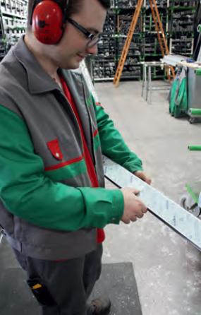 Kooperation mit Systempartner. Geht ein Auftrag bei Ruf Fassadentechnik ein, übernimmt ein Projektleiter zunächst die Planung. Die Profile des Systems „Firestop“ für die Fertigung der Türen bezieht das Unternehmen vom Systemanbieter Schüco. In der Arbeitsvorbereitung werden die Daten der Tür dann in SchüCal, eine Kalkulationssoftware des Bielefelder Unternehmens, übertragen. Das Programm gibt genau vor, welche Typen von Schlössern, Glashaltern, Gummierungen sowie welche weiteren Elemente in der jeweiligen Tür verbaut werden können. Zudem überprüft die Software nochmals die Einhaltung der zulässigen Maße. „Es ist sehr wichtig, die entsprechenden Vorgaben einzuhalten“, erläutert Sven Kluge, Metallbauer Fachrichtung Konstruktionstechnik. „Wenn wir davon abweichen, ist für die Türe eine Zustimmung im Einzelfall nötig, und das wird sehr kostspielig.“ Zusätzlich stehen in der Arbeitsvorbereitung umfangreiche Kataloge mit den Zulassungen, detaillierten Anleitungen und Einbauanweisungen zum Nachschlagen bereit.