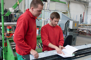 SchüCal übermittelt die Daten nach der Berechnung direkt an die Säge in der Fertigungshalle. Der Mitarbeiter dort weiß somit genau, auf welche Länge er die einzelnen Profile zuschneiden muss. Ein in die Maschine integrierter Drucker gibt gleichzeitig einen Barcode aus, der auf das bearbeitete Element aufgeklebt wird. Über die Codierung lässt sich ermitteln, zu welchem Auftrag das Bauteil gehört, und welche weiteren Bearbeitungsschritte auszuführen sind. An der nächsten Station, dem Bearbeitungszentrum, scannt ein Mitarbeiter diesen Code ein. Die Anlage passt dann die Halterungen dem zu bearbeitenden Bauteil an, und der Mitarbeiter kann das Profil einlegen. Die weiteren Schritte wie Fräsen und Bohren übernimmt die Maschine vollautomatisch. Auch die notwendigen Werkzeugwechsel führt die Anlage autonom aus. Anschließend übernehmen die Fachkräfte die Montage der Profile und den Einbau der einzelnen Elemente wie Gummierungen, Schlösser, Glashalter und Sicherungsbolzen in Handarbeit. Eine einflüglige Tür kann innerhalb eines Arbeitstags fertiggestellt werden. „Da wir die Firestop-Profile von Schüco beziehen, haben wir bereits einen hohen Vorfertigungsgrad“, berichtet Christian Ruf. „Gleichzeitig ermöglicht uns das hohe Individualität bei der Fertigung und eine genaue Einschätzung der Fertigungszeiten.“