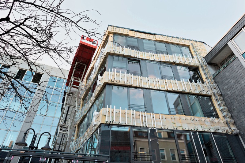 Der fünfgeschossige Stahl-Beton-Skelett-Bau aus dem Jahr 1964 stellte die Planer neben seiner energetisch nachteiligen Konstruktion durch die beengte innerstädtische Lage vor zusätzliche Herausforderungen: So ist nicht nur der Tageslichteinfall durch die unmittelbar angrenzende Nachbarbebauung auf der Nord-, West- und teilweise Ostseite deutlich reduziert, auch bot das Flachdach relativ wenig Installationsfläche für Solartechnik. Darüber hinaus galt es, die Innenstadt mit einer neuen straßenseitigen Fassade architektonisch aufzuwerten.