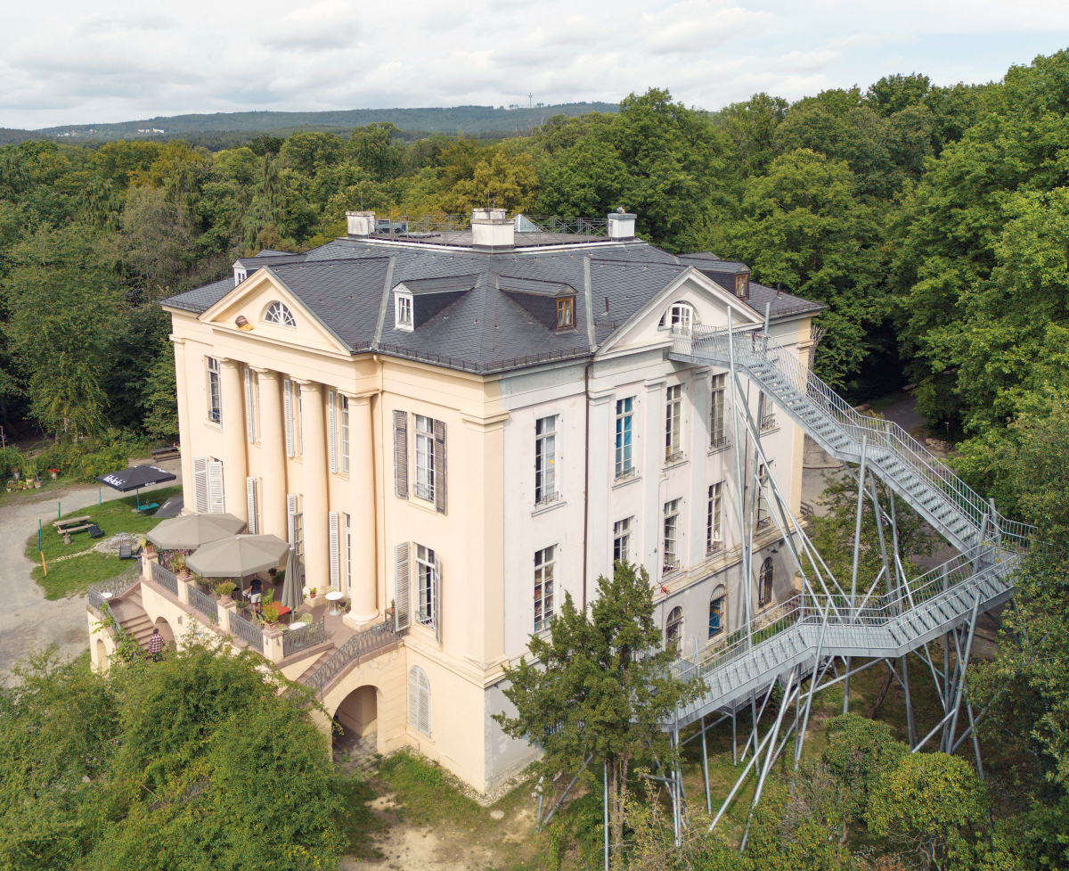 Zur sicheren Entfluchtung erhielt Schloss Freudenberg in Wiesbaden-Dotzheim eine außen liegende, feuerverzinkte Stahltreppe, die zum Mansardengeschoss führt. Der Zugang zu einem Tagungszentrum ist als...