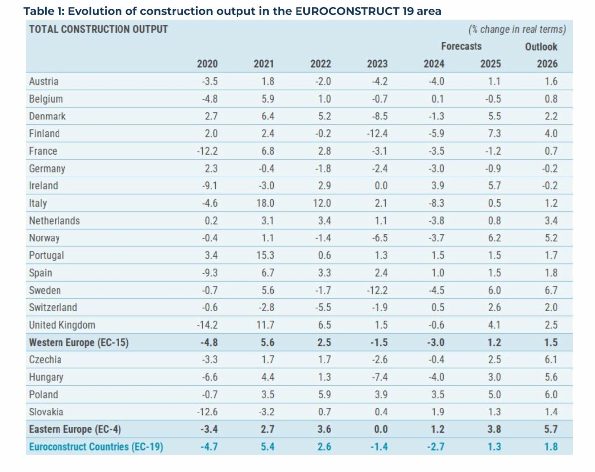 Prognose für Deutschland: -3% in 2024 18.07.2024 |Für 2024 wird gemäß der Übersicht von Euroconstruct vom Juni 2024 für die 19 Länder im Euroconstruct-Raum eine Fortsetzung des negativen Trends mit einem Rückgang von etwa 2,7 Prozent prognostiziert. Erst in 2025 soll es den Wendepunkt geben, der sich in 2026 fortsetzen soll. Die Zahlen der einzelnen Länder zeigt die Grafik.