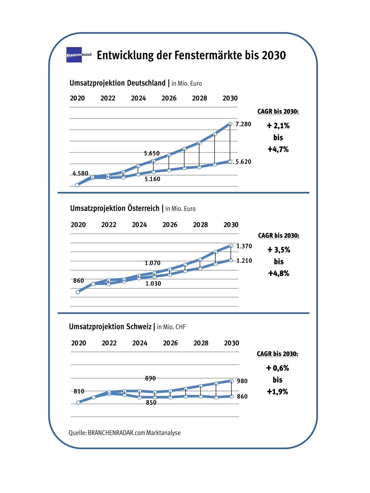 Eine Gemeinsamkeit besteht in etwa nur darin, dass in den letzten zehn Jahren Fenstererzeuger allerorts Wertschöpfung an vor- und nachgelagerte Segmente der Wertschöpfungskette abgegeben haben. Um diesem Trend entgegen zu wirken, wird die Fensterindustrie daher wohl ihre auf den Absatz orientierte Verkaufsstrategie überdenken müssen. Zumal auf lange Sicht sich das Marktpotential einebnet. Selbst unter der Annahme, dass als Folge der gesetzlichen Maßnahmen zur Eindämmung des Klimawandels der Renovierungsmarkt wieder deutliche Wachstumsimpulse liefert wächst die Nachfrage bis 2030 in Deutschland nur um durchschnittlich 0,9 Prozent pro Jahr und in Österreich um 0,5 Prozent. Das Szenario für die Schweiz geht sogar nur von stabilen Mengen aus.