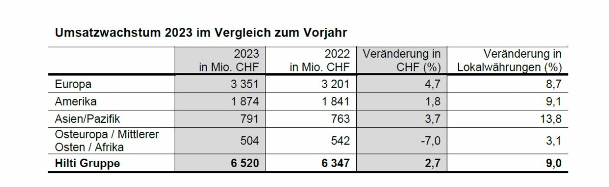 Im Jahr 2023 konnte die Hilti Gruppe mit einem Umsatzplus von 9,0 Prozent in Lokalwährungen stärker wachsen als die Bauindustrie. Die stark negativen Währungseffekte schlugen sich in einem deutlich niedrigeren Wachstum von 2,7 Prozent in Schweizer Franken nieder. Der Gesamtumsatz 2023 betrug CHF 6,5 Mrd.