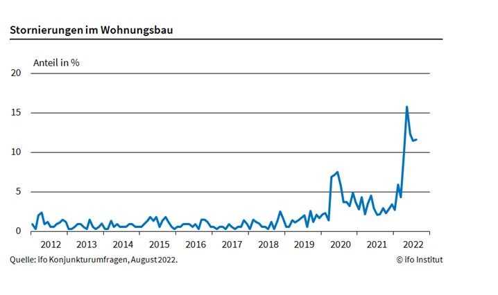 Auftragsstornos nehmen zu 19.09.2022 |Wie das ifo-Institut heute meldet, kommt es im Wohnungsbau weiterhin vermehrt zu Auftragsstornierungen. Im August waren 11,6 Prozent der befragten Unternehmen betroffen, nach 11,5 Prozent im Vormonat.