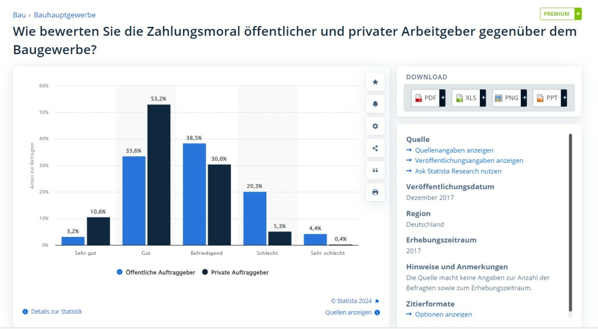 Jüngste Umfrage: Wie bewerten Sie die Zahlungsmoral öffentlicher und privater Auftraggeber gegenüber dem Baugewerbe? Erhebungszeitraum 2017.