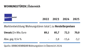 Die nach wie vor sinkenden Fertigstellungen in Mehrfamilienhäusern spiegeln sich auch am Markt für Wohnungstüren wider. Laut aktuellem Branchenradar Wohnungstüren in Österreich sanken im Jahr 2025 die...